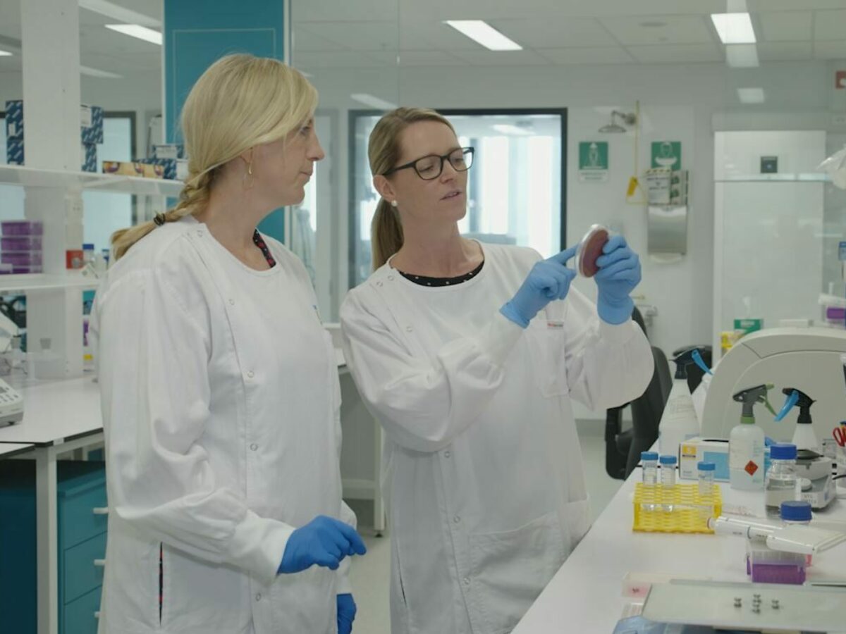 Picture: Microbiologists Dr Lea-Ann Kirkham and Dr Elke Seppanen (credit Telethon Kids Institute)