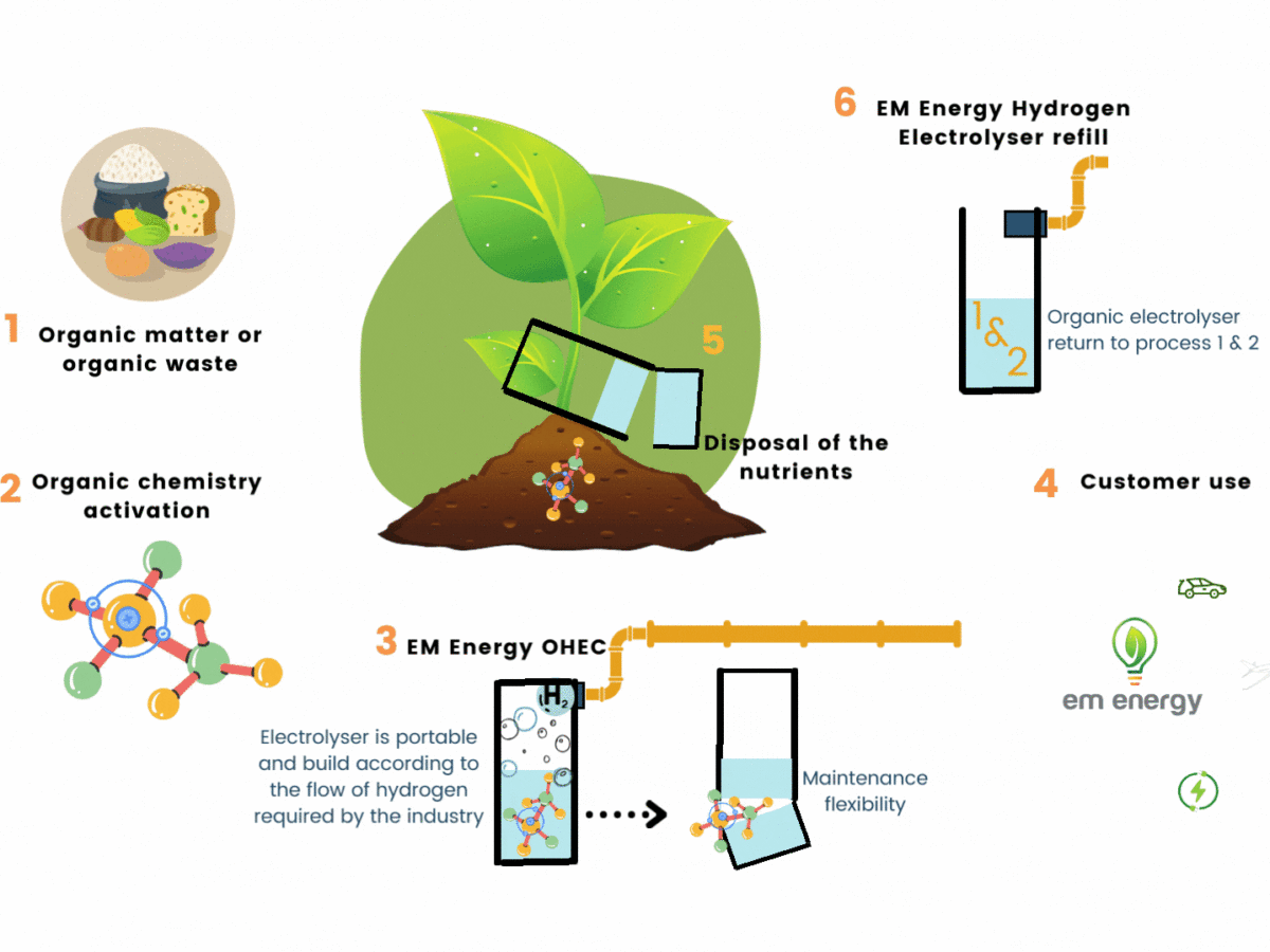 According to EM Energy's website, OHEC is the invention of environmental/chemical engineer Isabel Toasa, the company’s co-founder and Head of Research, and “uses organic activation that produces self-energy and supports electrolysis by releasing free hydrogen radicals from the organic matter.”