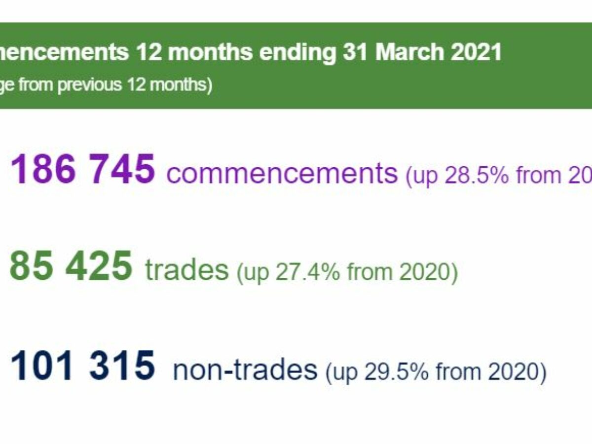 Commencements increased across trade by 33.3 per cent and non-trade occupations by 37.8 per cent when compared with the same quarter in 2020, with the largest absolute increases seen in construction trade workers, clerical and administrative workers, and community and personal service workers.