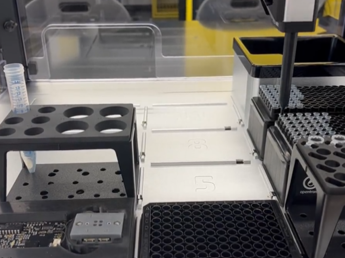 In the platform (pictured) a fluid sample is pipetted onto the active sensing site using a programmable robot, allowing the electronic properties of the fluid sample to be tested and analysed. The results can then be electronically be read out on a computer.