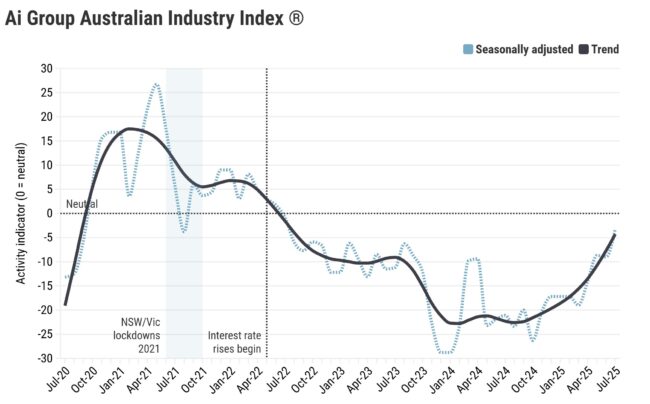 Australian industry showed signs of recovery in July, driven primarily by business services, whilst manufacturing continued to struggle, according to the latest Ai Group Australian Industry Index released on Tuesday. The index improved by 5.8 points to -3.2 seasonally adjusted in July, marking its strongest score in three years. Business services led the recovery, continuing…