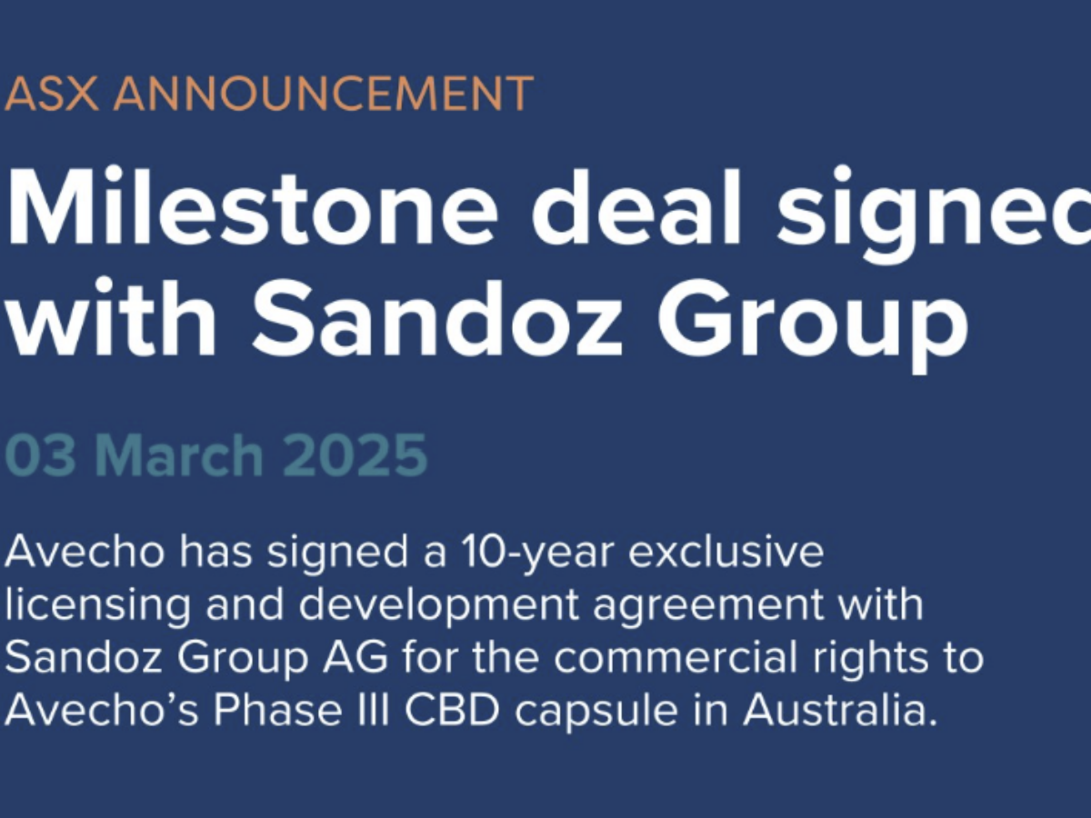 Avecho Biotechnology signed an exclusive ten-year development and licensing agreement with Sandoz for the commercial rights to its cannabidiol (CBD) insomnia treatment in Australia, according to an ASX announcement released on Monday.