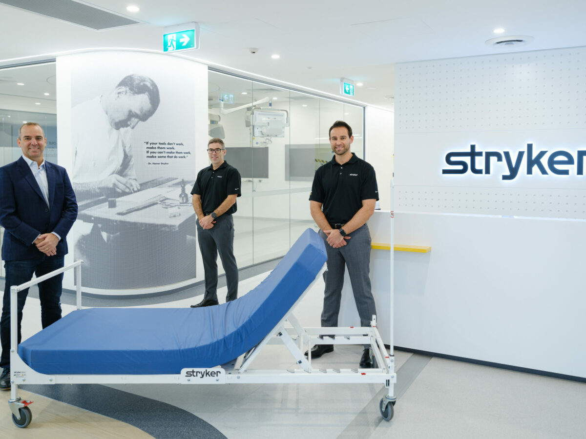 Picture: Stryker Emergency Relief Bed with Stryker Australia’s staff L-R: Maurice Ben Mayor, President Stryker Australia; Lachlan McKenzie, Regulatory Principle Stryker Australia; Elias Waked, Business Development Manager, Stryker Medical (supplied)