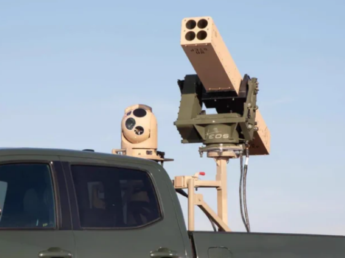 An EOS gimbal mounting system (pictured) is part of the Vampire counter-drone system, which can launch guided weapons from the tray of a utility vehicle.