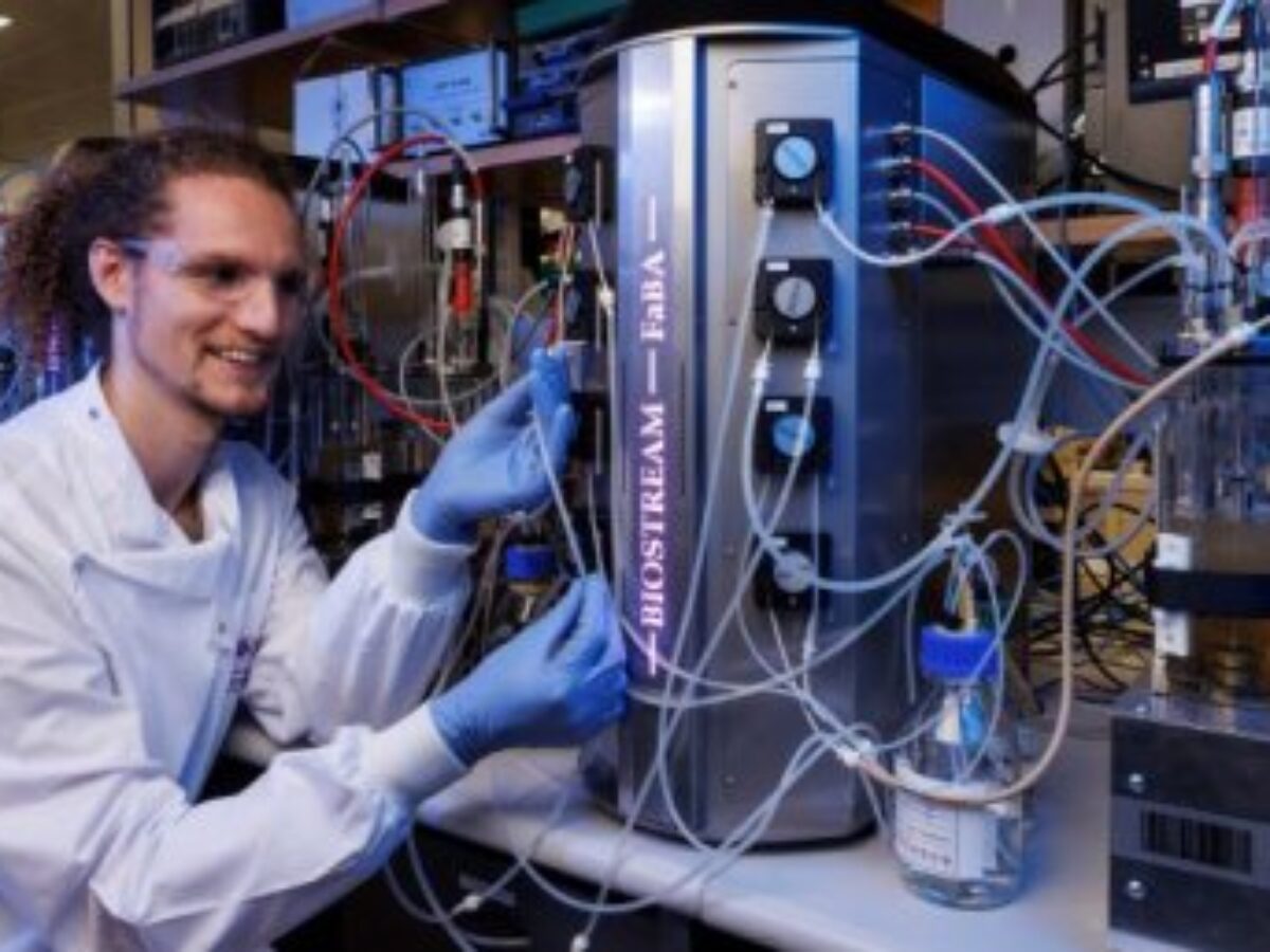 Picture: Dr James Heffernan working with a FaBA-funded bioreactor (credit UQ)