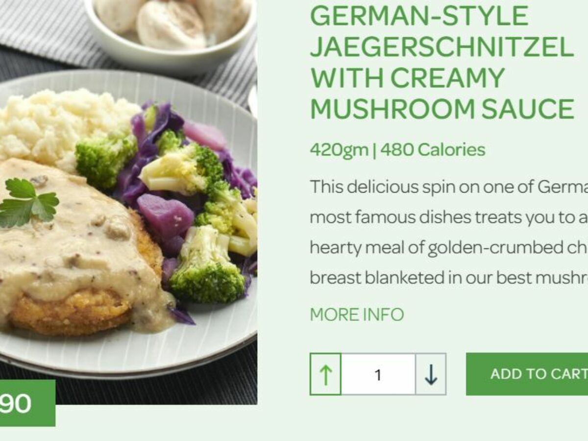Its website lists meals such as German-style Jaegerschnitzel with creamy mushroom sauce (pictured) for $10.90.