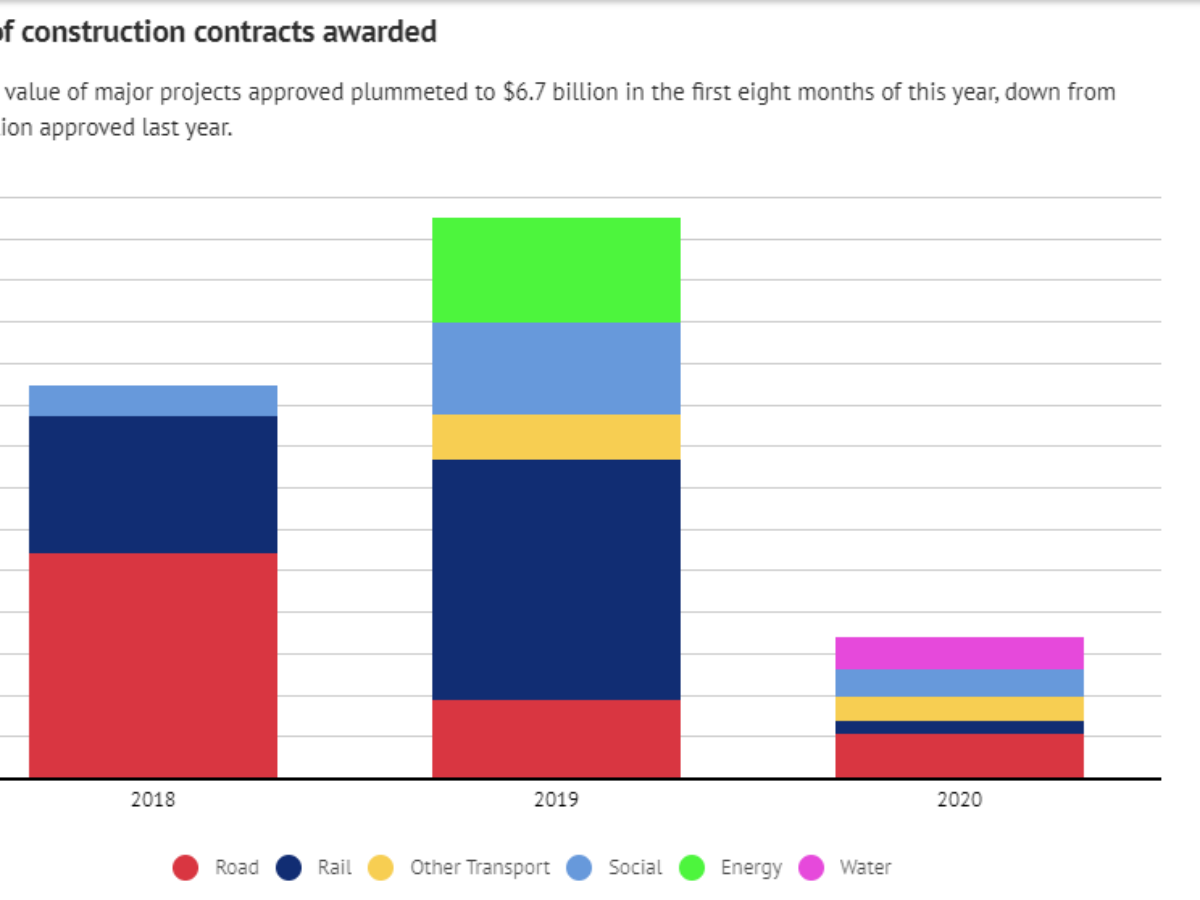 Far from an infrastructure boost, the value of major contracts being awarded fell to $6.7 billion in the first eight months of this year, down from $27.1 billion approved last year.