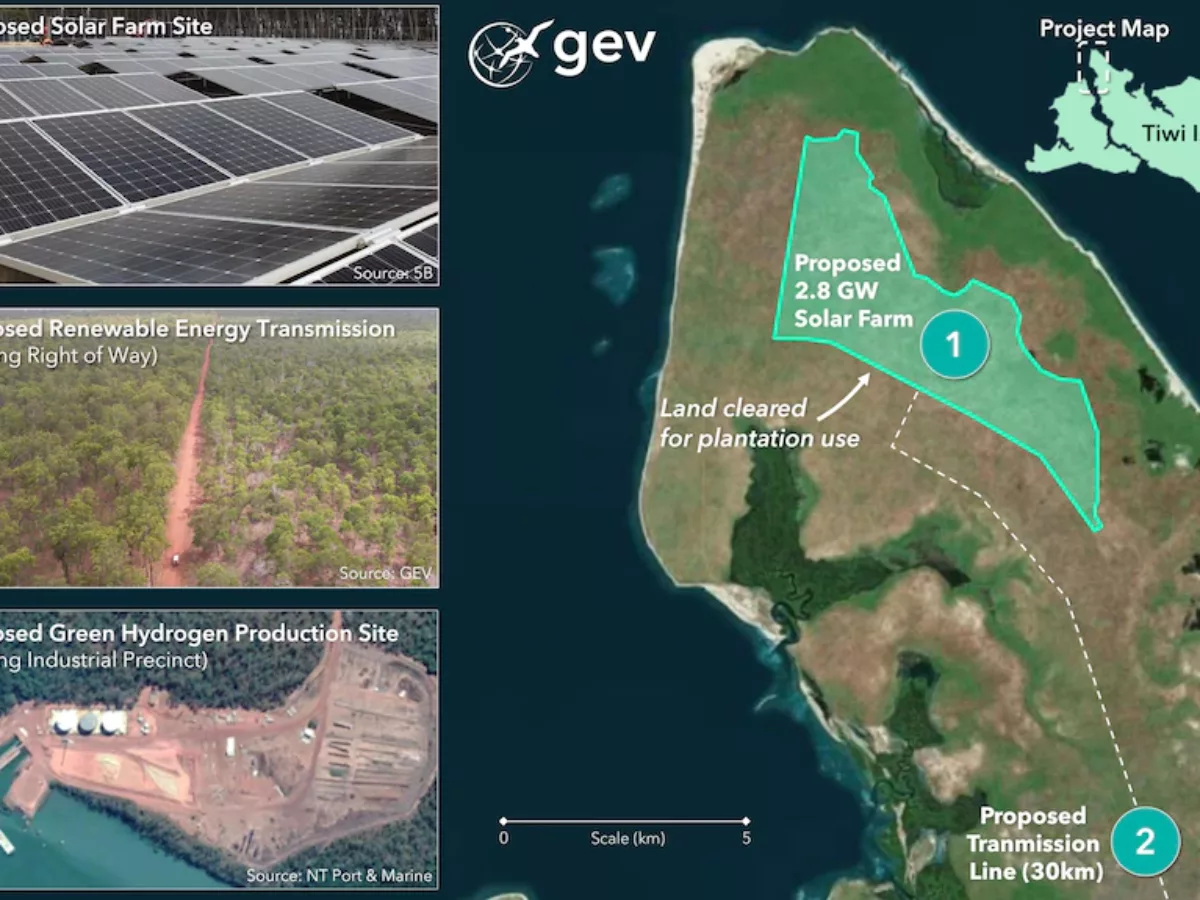 GEV plans a 2.8 GW solar pv array, a 30km electricity transmission line and a green hydrogen and production facility at Port Melville on the northern tip of Melville Island, the larger of the two Tiwi Islands.