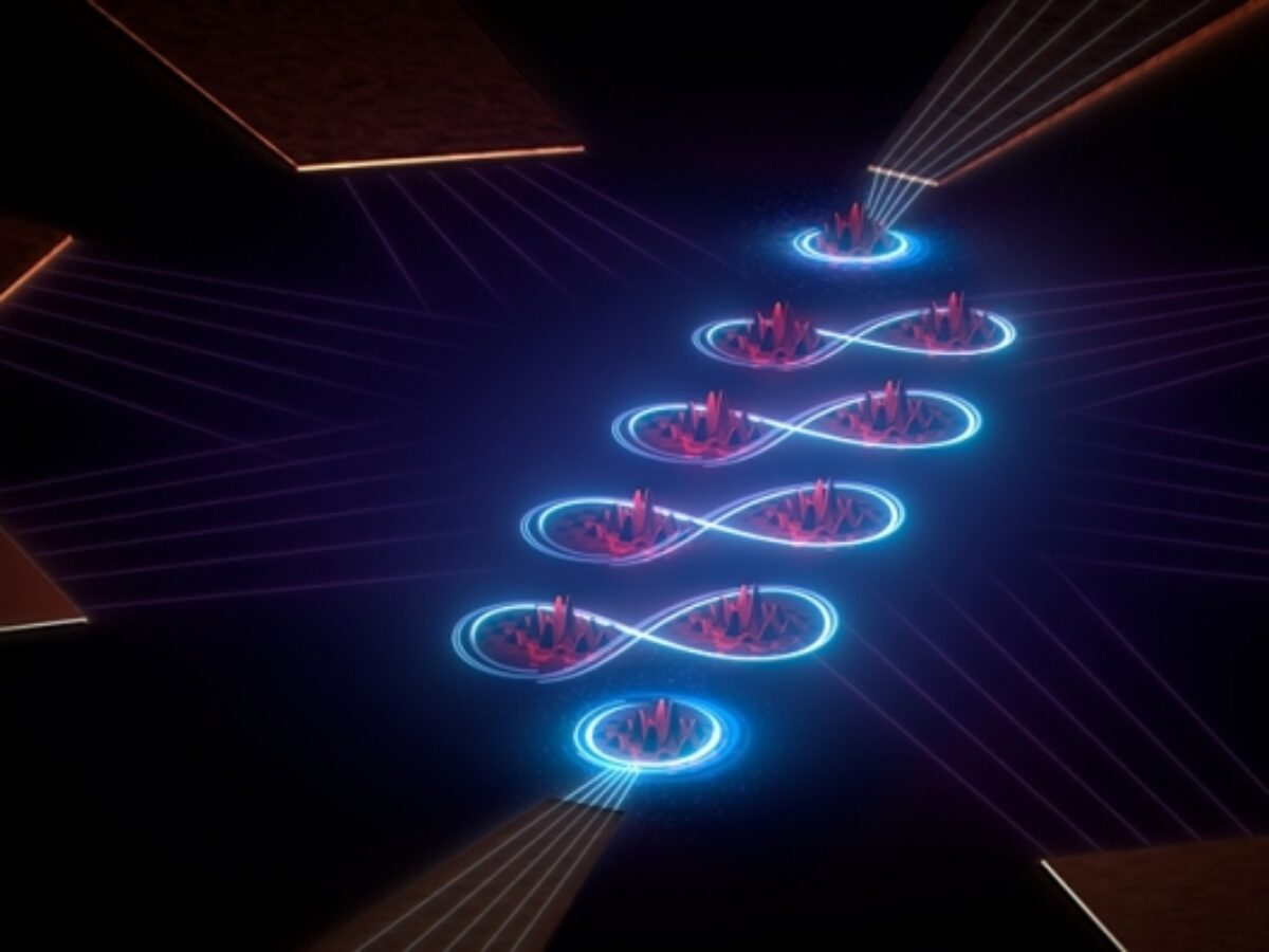 Picture: Artist's impression of the quantum integrated circuit modeling the carbon chain. Simulated carbon atoms are red, electrons exchanged between them are in blue. (Image credit SQC)