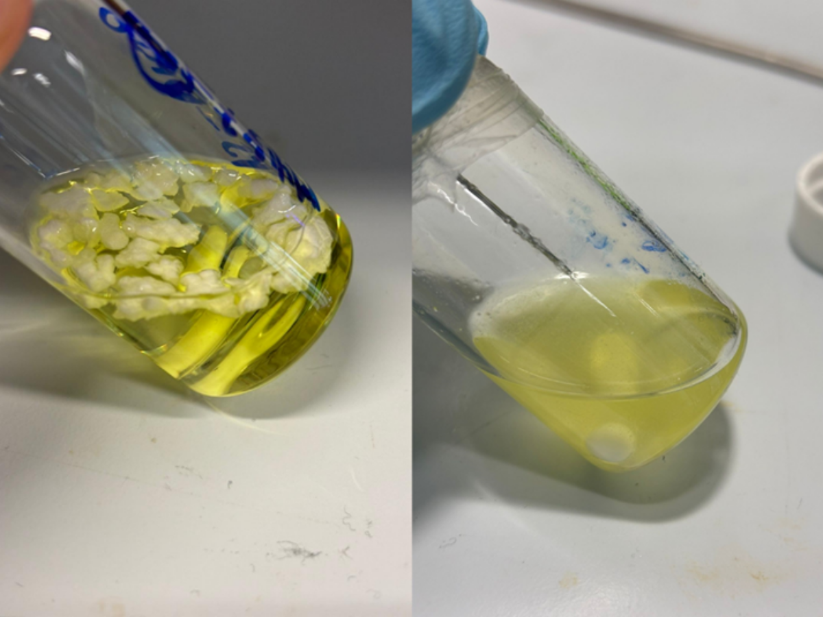 Picture: Related work from the research team showing polystyrene breaking down in solvent. (credit Maxime Michelas and Cyrille Boyer, UNSW)